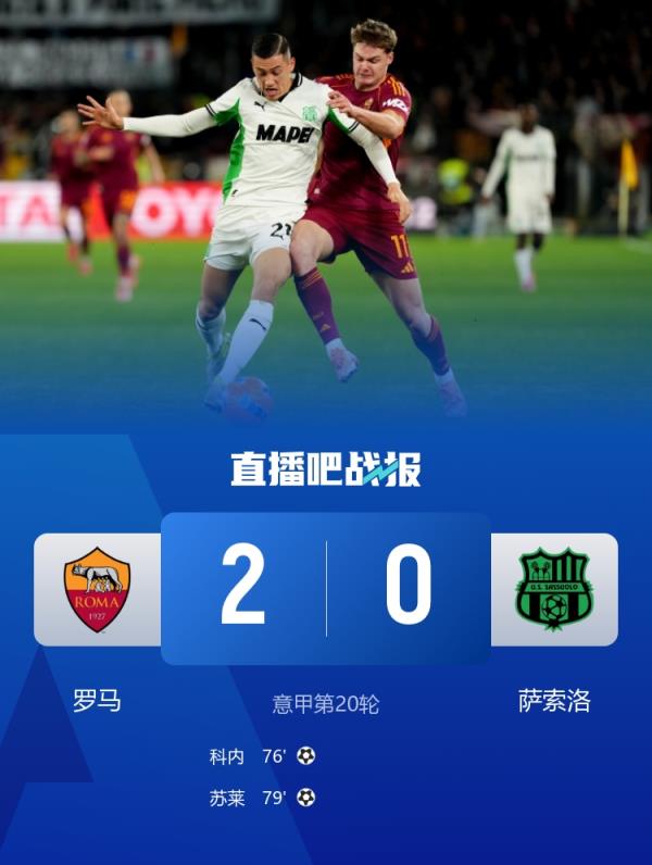 罗马主场2-0战胜萨索洛,罗马取得联赛两连胜+先赛积39分升至第3名。