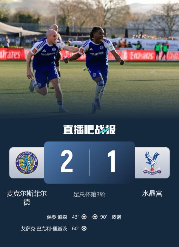 足总杯第3轮,第6级别球队麦克尔斯菲尔德2-1淘汰卫冕冠军水晶宫,爆出惊天冷门!