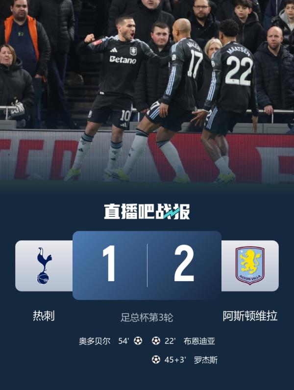 维拉2-1淘汰热刺,进入足总杯32强,维拉方面罗杰斯、布恩迪亚破门。