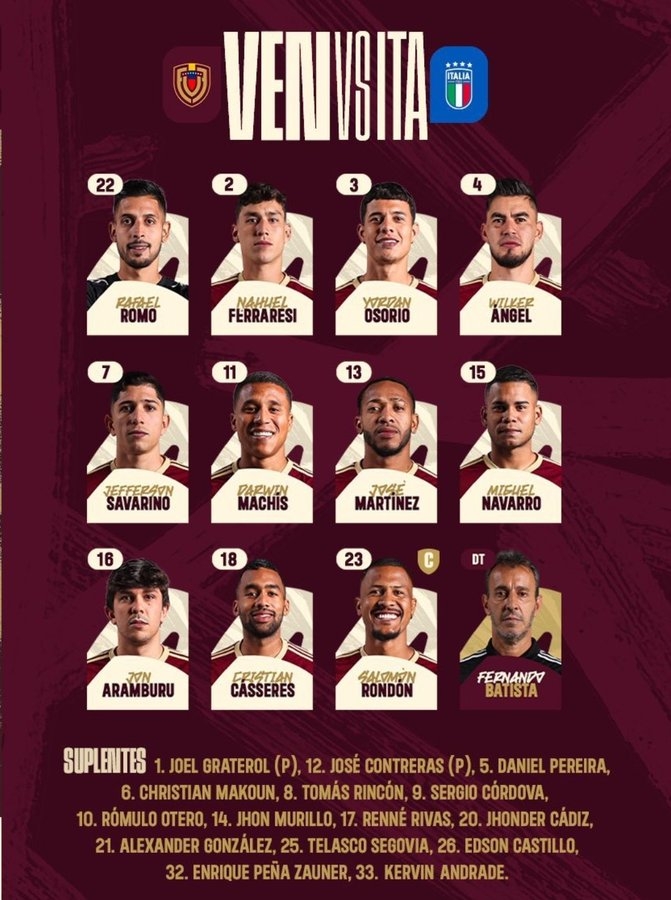 委内瑞拉替补:1-格拉特罗、12-孔特雷拉斯、5-丹尼尔-佩雷拉、6-马库恩、8-林孔、9-科尔多瓦、10-奥特罗、14-穆里略、17-里瓦斯、20-卡迪斯、21-亚历山大-冈萨雷斯、25-塞戈维亚、26-卡斯蒂略、32-恩里克-佩尼亚、33-安德拉德