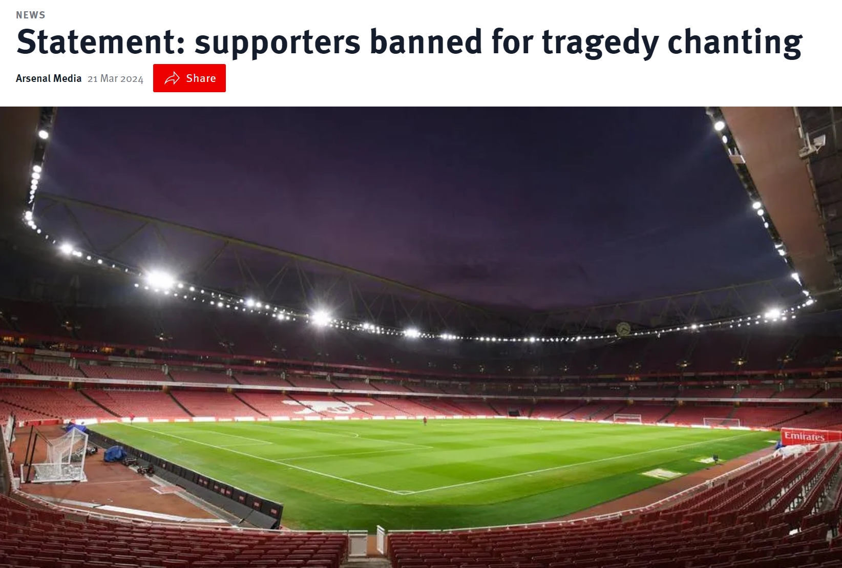 3月22日讯 阿森纳今日在官网发布声明,3名在对阵利物浦的比赛中喊悲剧性口号的阿森纳球迷已经被禁止观赛3年。
