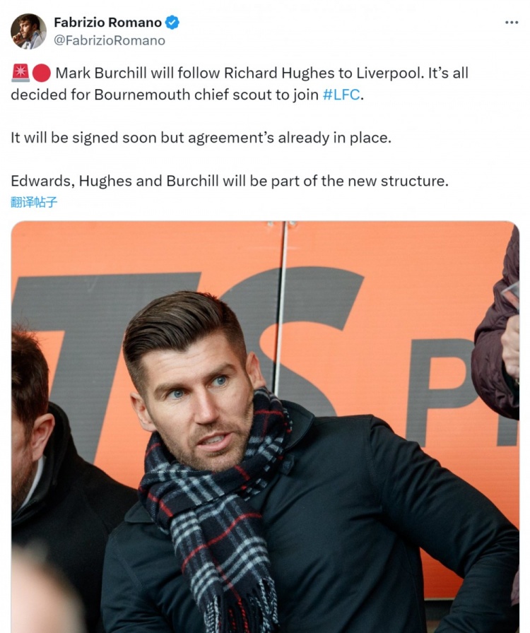 罗马诺进一步指出,伯恩茅斯首席球探伯奇尔将跟随休斯加盟利物浦,一切都已经决定,伯奇尔与利物浦就加盟事宜达成协议,很快就会签署合同,他将与爱德华兹、休斯一起成为俱乐部新组织架构的一部分。