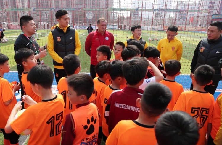 与见面会遥相呼应,同样在23日中午,中国之队公益行在天津大吉利体育城足球场举办。活动现场,与助理教练陈涛,国脚蒋圣龙、王振澳和程进游戏互动的,是来自天津足协青训中心梯队的25名小球员。