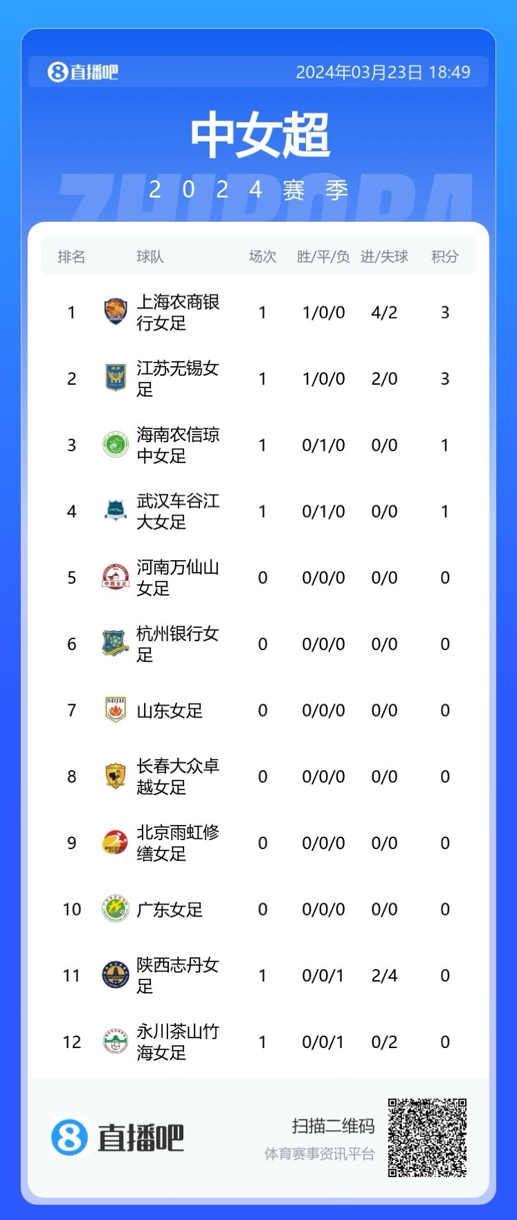 3月23日讯 新赛季女超联赛今日开战,在率先进行的3场第一轮赛事中,卫冕冠军武汉江大0-0战平海南琼中,上海农商银行4-2击败陕西志丹。