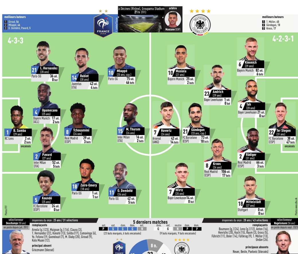 3月23日讯 北京时间明天凌晨4时,法国与德国将进行一场友谊赛,法国媒体队报对两队本场首发进行了预测。