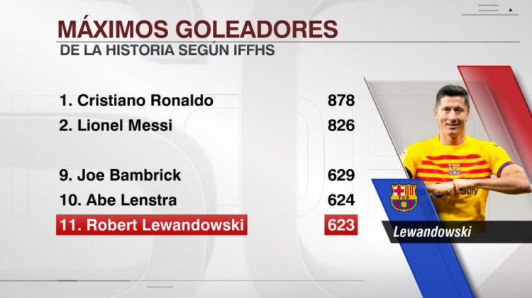 根据国际足球历史和统计联合会的数据,莱万职业生涯至今已经打进623球,在历史射手榜中排名第11位,仅比排名第10位的伦斯特拉少1球。