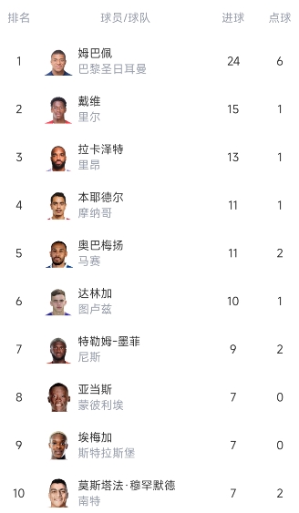 射手榜方面,姆巴佩24场24球居首,乔纳森-戴维15球第二,拉卡泽特13球第三,本耶德尔和奥巴梅扬11球并列第四。