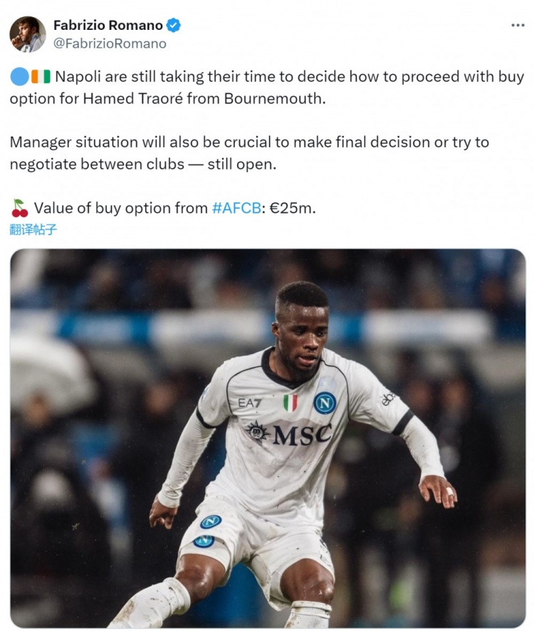 那不勒斯主帅的情况也是俱乐部做出最终决定或与伯恩茅斯开启谈判的关键因素,目前卡尔佐纳担任球队的临时主帅,但那不勒斯仍存在今夏换帅的可能性,特拉奥雷的选择买断费用为2500万欧元。