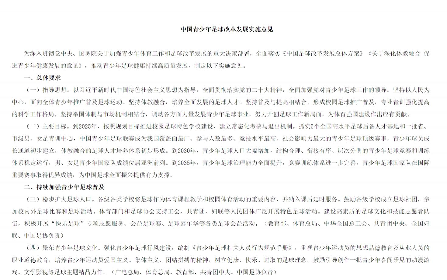 (二十五)明确职责分工。体育部门牵头全国青少年足球工作,负责青少年足球发展的总体规划、宏观指导、统筹协调和督查督导;教育部门履行好青少年校园足球主管责任,负责校园足球统筹规划、综合管理和推进落实,为青少年足球苗子制定和落实升学保障等相关政策;中国足协及其会员协会发挥人才和资源优势,加强对青少年足球的行业指导和技术服务。(体育总局、教育部、中国足协负责)