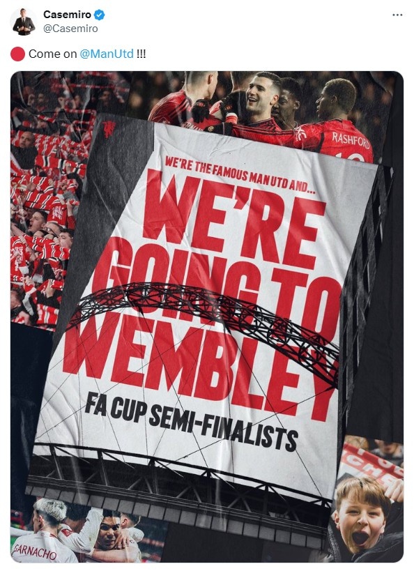 卡塞米罗上传了印有:“我们是著名的曼联,我们要去温布利——足总杯半决赛”字样的条幅,并配文写道:“加油曼联!”
