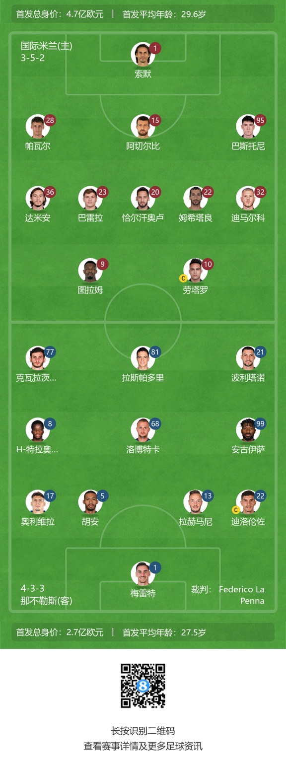 3月18日讯 意甲第29轮 国际米兰主场迎战那不勒斯,赛前首发名单公布。