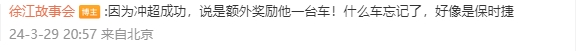 同时徐江在回复网友评论时表示:因为冲超成功,说是额外奖励他一台车!什么车忘记了,好像是保时捷。