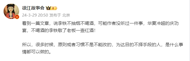 而媒体人徐江透露:看到一篇文章,说李铁不抽烟不喝酒,可能作者没听过一件事,华夏冲超的庆功宴,不喝酒的李铁敬了老板一壶红酒!