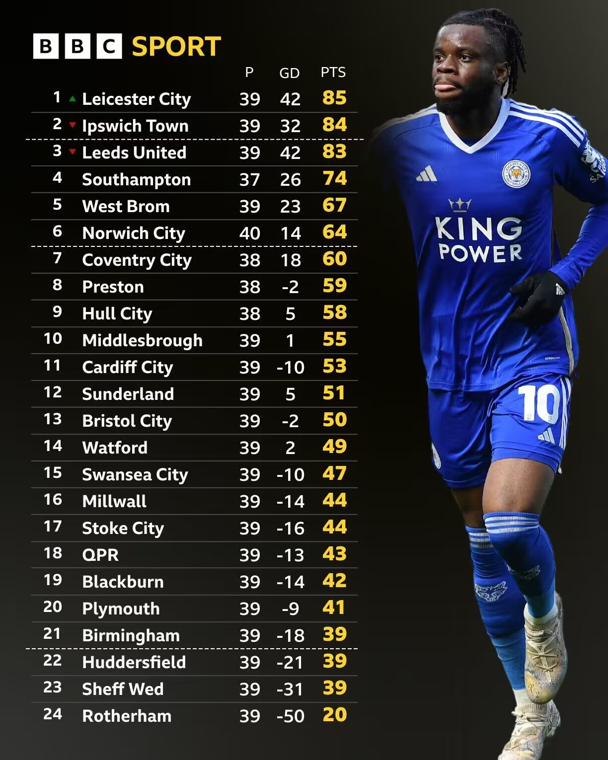 04月01日讯 英冠第40轮,莱斯特城主场3-1击败诺维奇,重返英冠榜首。