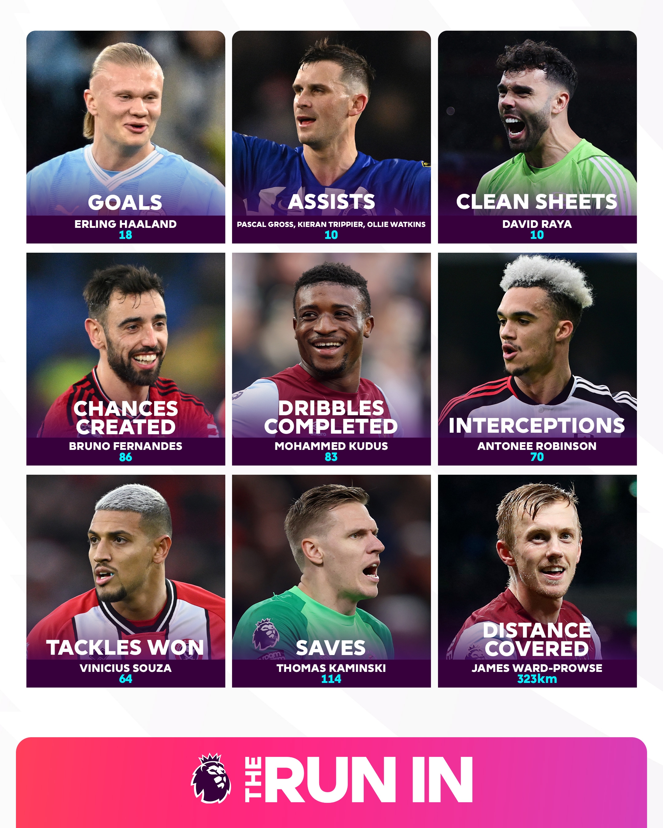 2、助攻王:特里皮尔(纽卡)、沃特金斯(维拉)、格罗斯(布莱顿)——10次