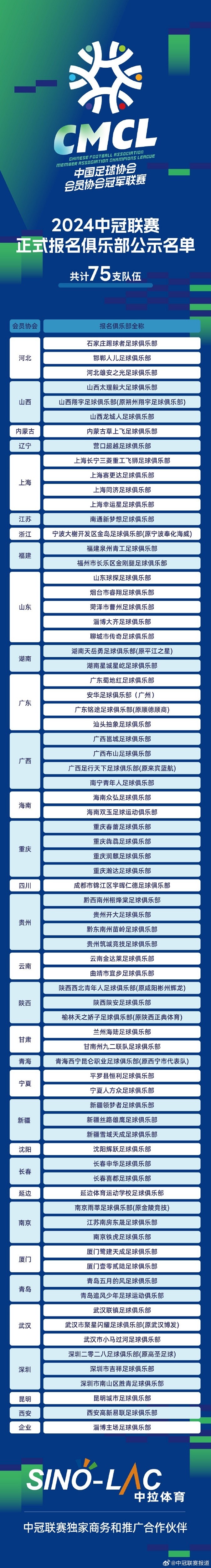 2024赛季中冠联赛正式报名工作于3月29日结束,共有75支俱乐部报名并缴纳参赛保证金,中冠官方将报名俱乐部名单公示3天(至2024年4月4日)。