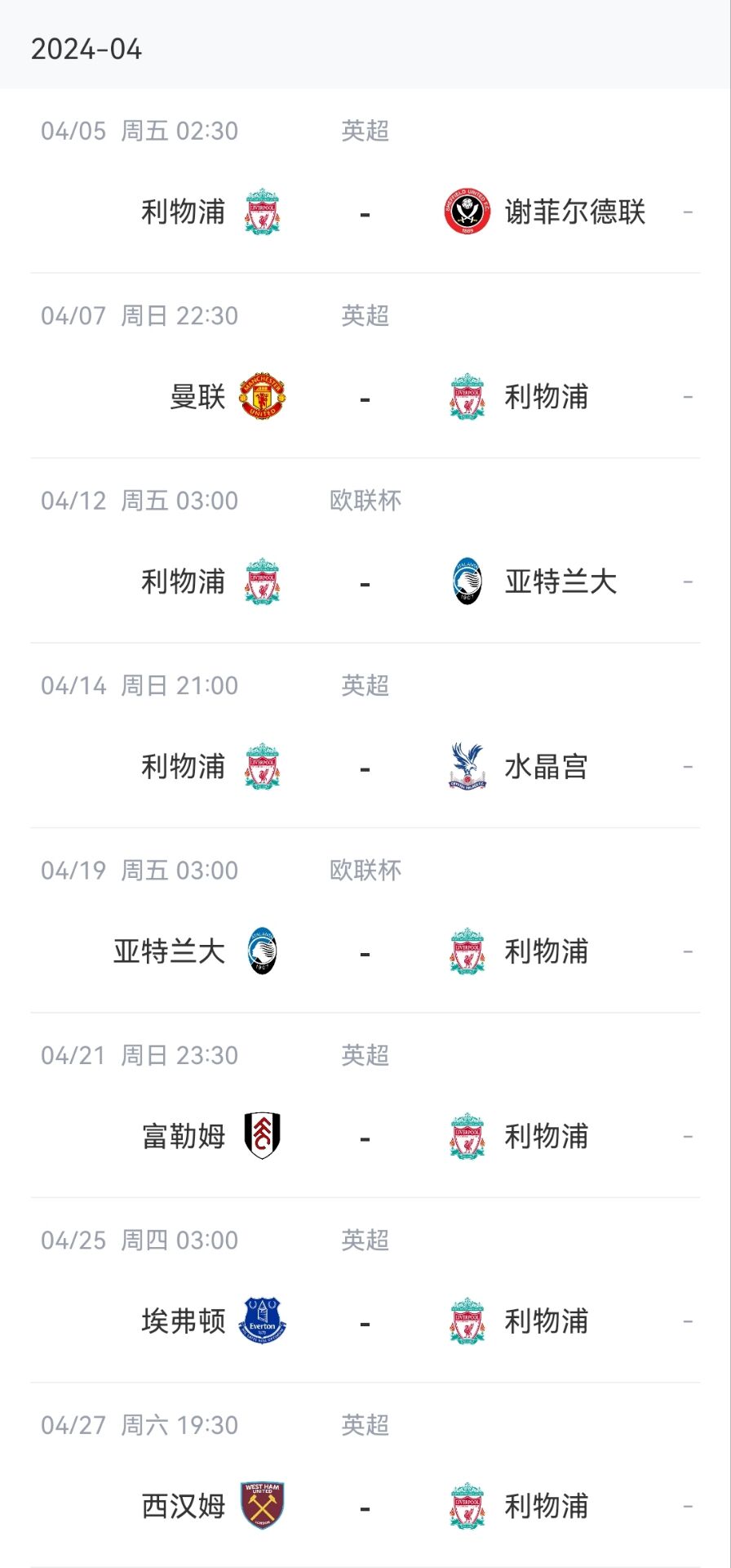进入4月,英超开始季末冲刺期,将有两轮比赛在周中进行,加上欧战的比赛,目前英超前3利物浦、阿森纳、曼城在整个4月份都将面临一周双赛的考验。