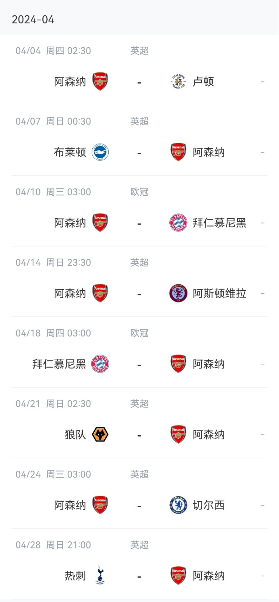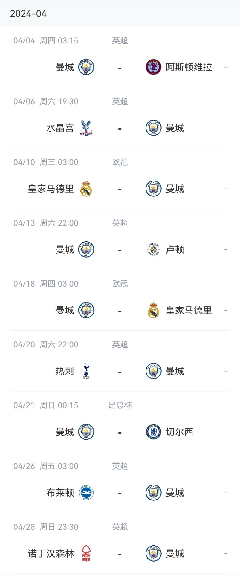 曼城4月份赛程↓(与热刺的比赛将延期举行)