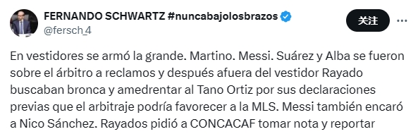 据记者Fernando Schwartz报道,梅西、马蒂诺、阿尔巴和苏亚雷斯赛后冲着裁判抱怨,随后前往更衣室找蒙特雷主帅奥尔蒂斯,因为奥尔蒂斯之前采访时说过裁判可能会偏袒美职联球队。