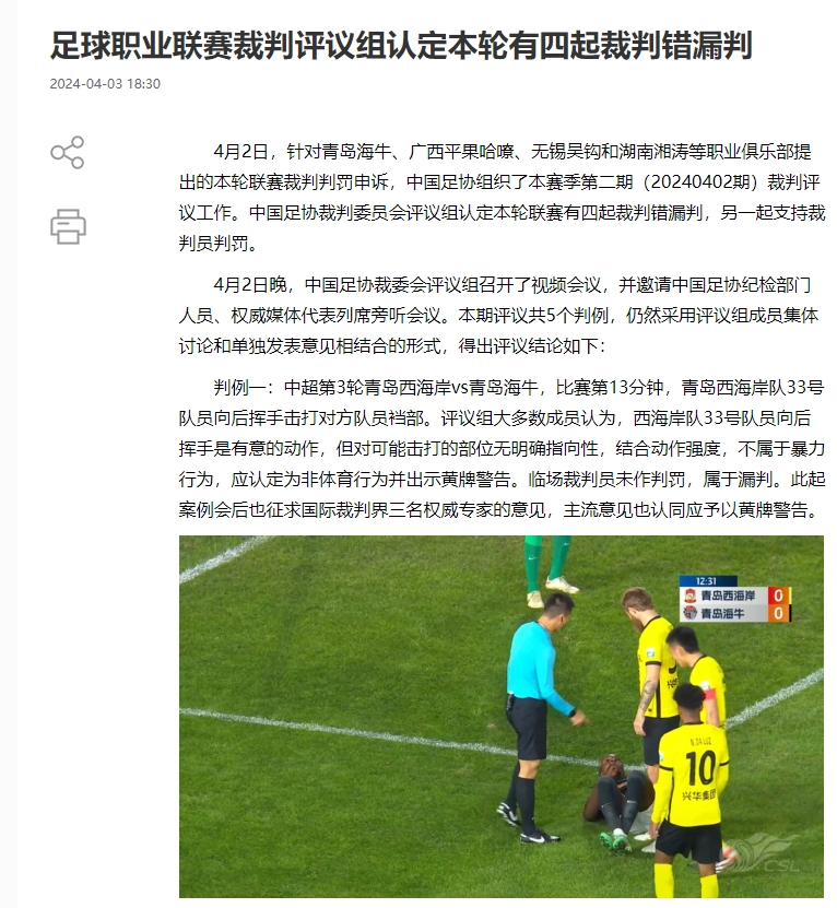 4月3日,足协发布本赛季第二期裁判评议,认定本轮比赛有四起裁判错漏判。本次裁判评议,足协还原了详细完整的判罚细节,并且附有当时的比赛视频。